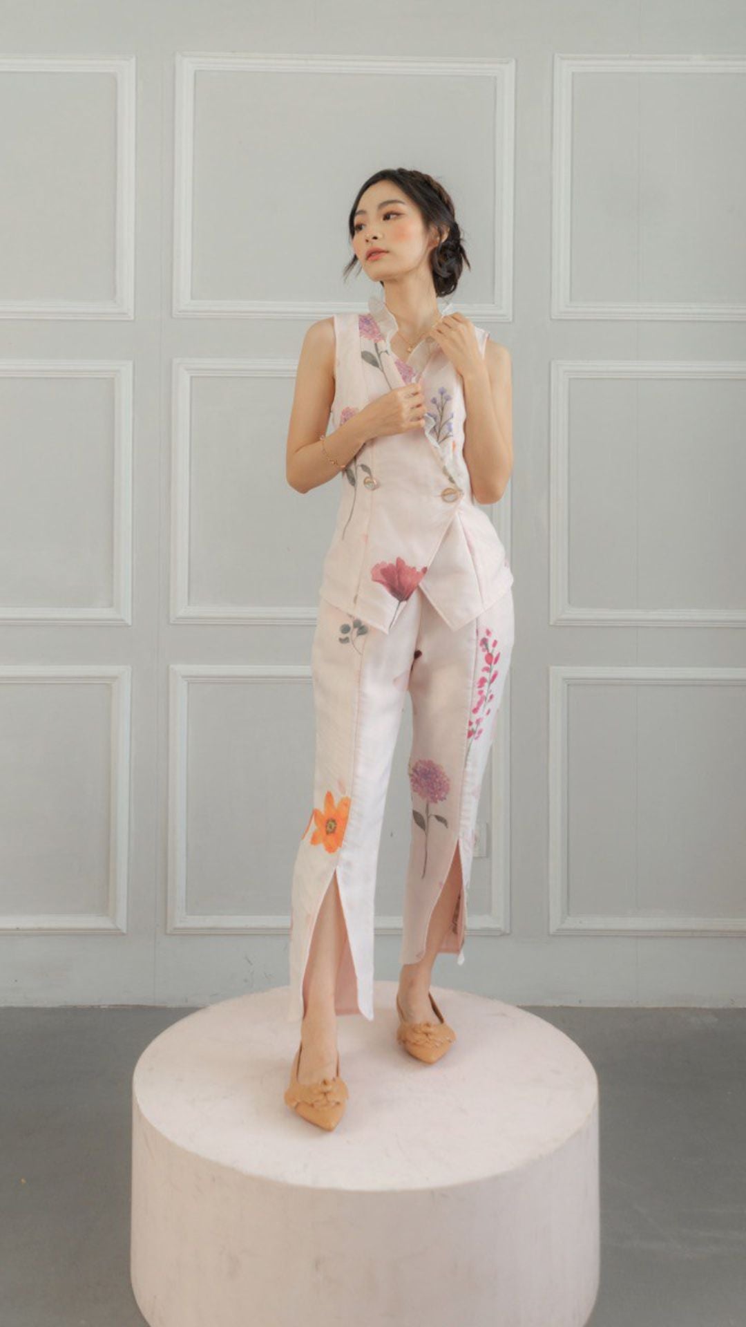 An ankle-length trousers with front-slits; all covered in our original design floral prints