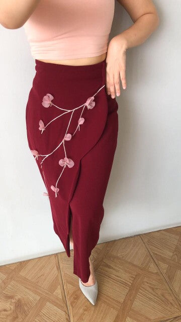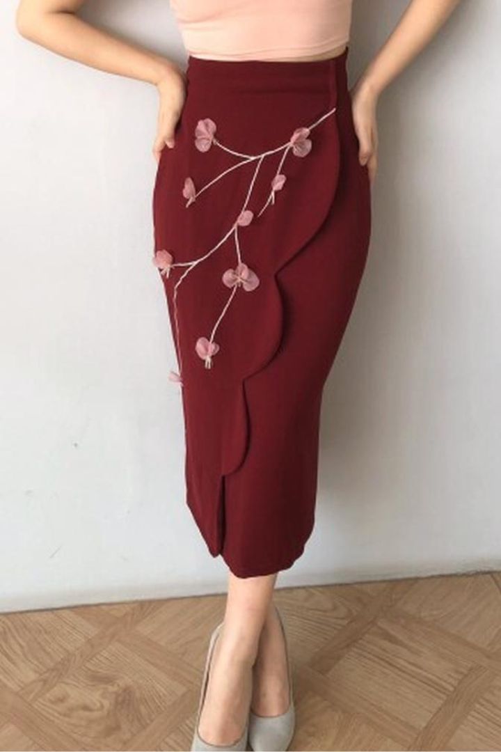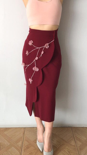 High-waisted, assymetrical pencil skirt with scallop-shaped edges & our signature embroideries