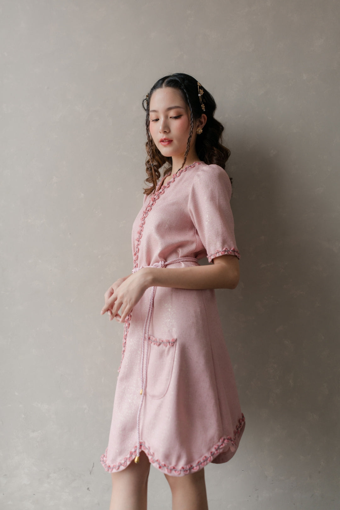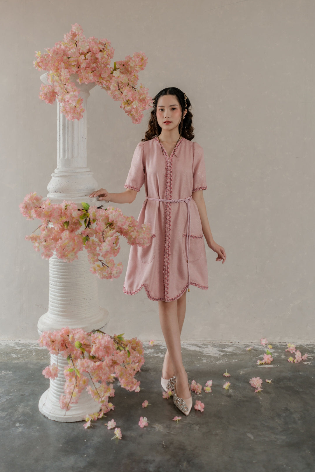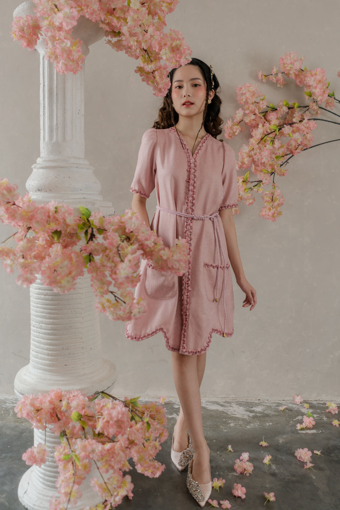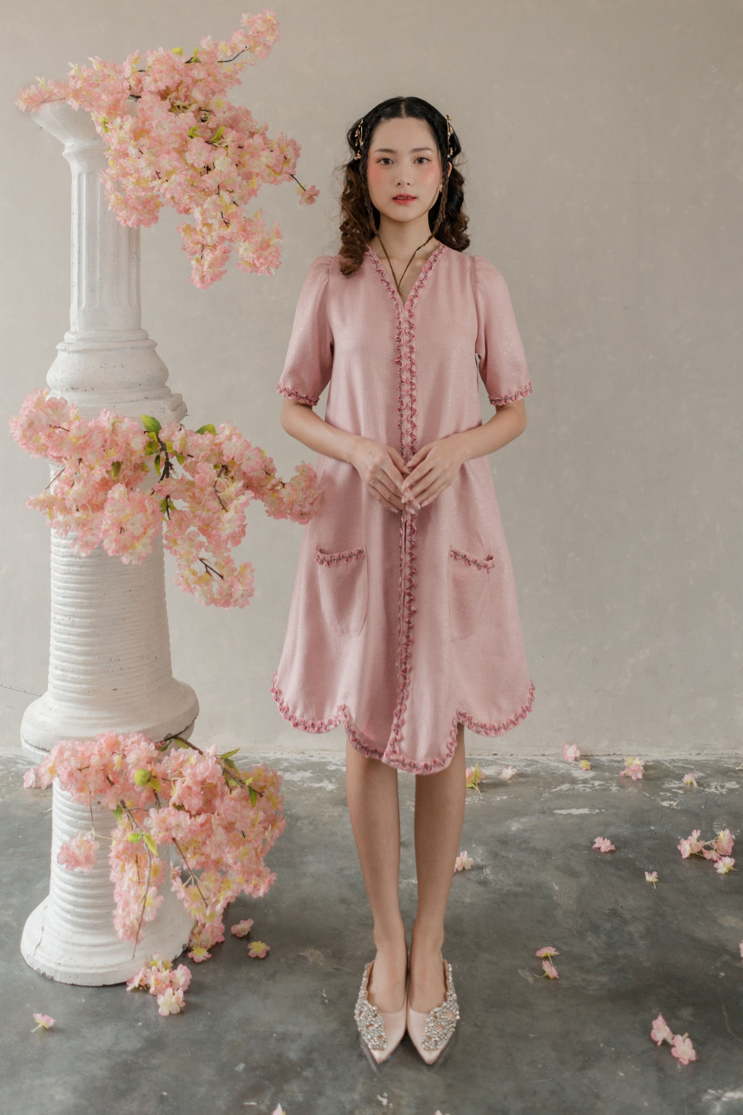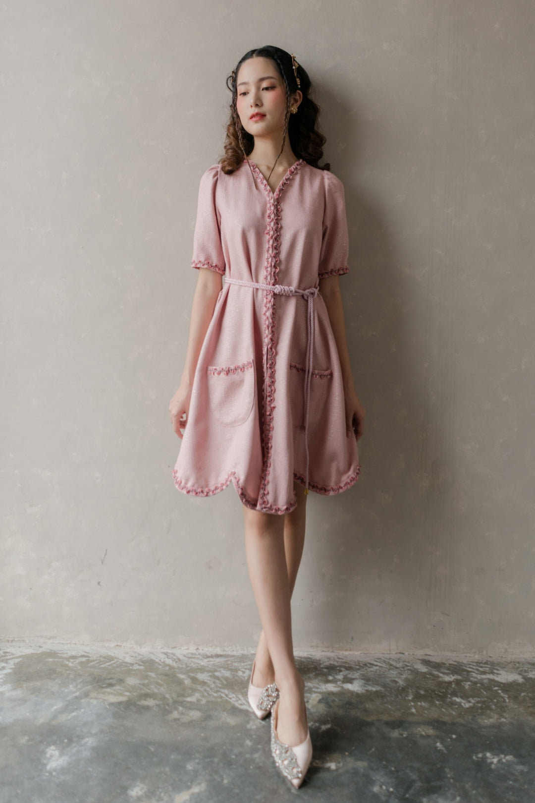 A-line dress with v-neck & intricate embroideries on the hemlines.