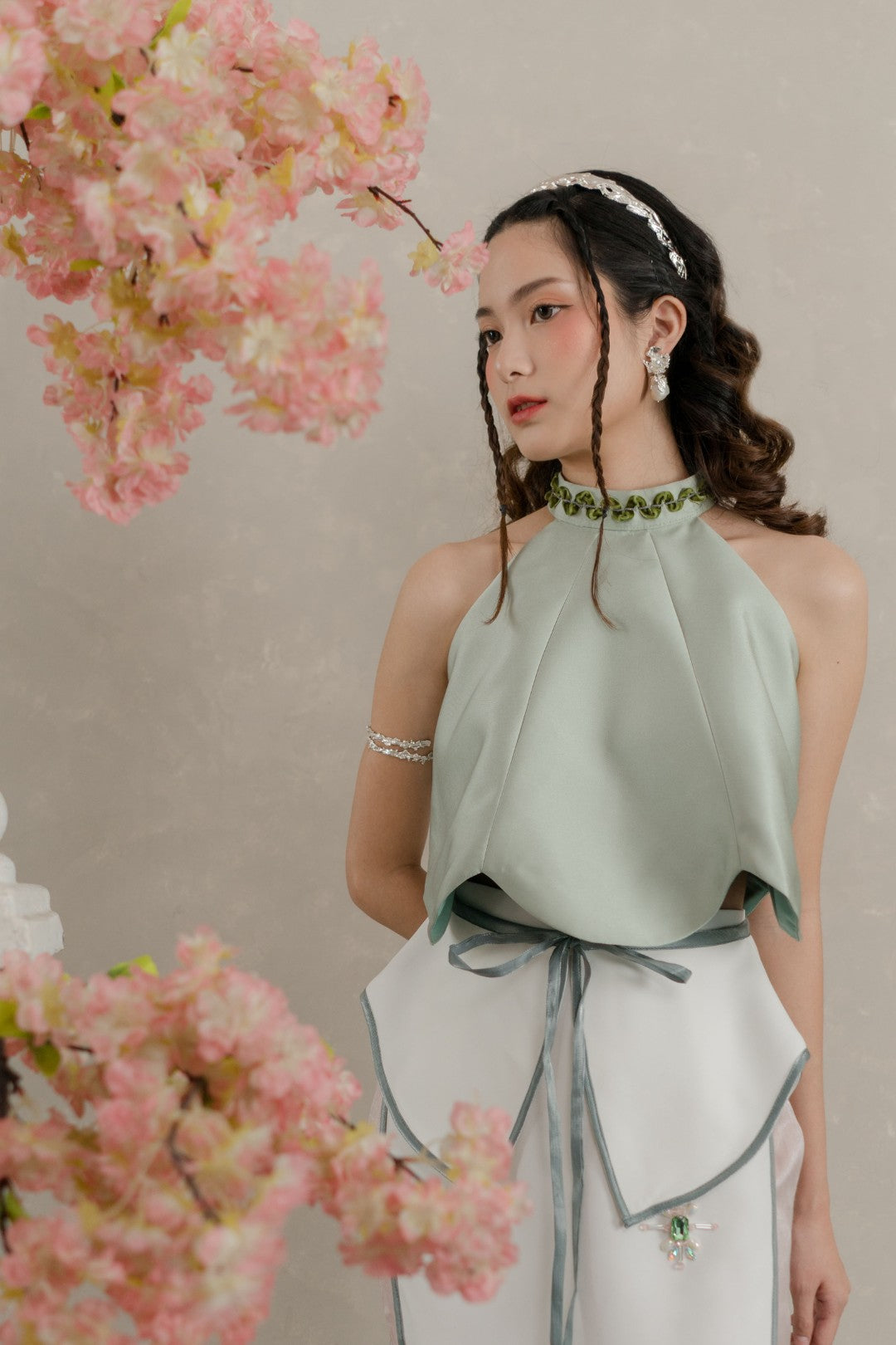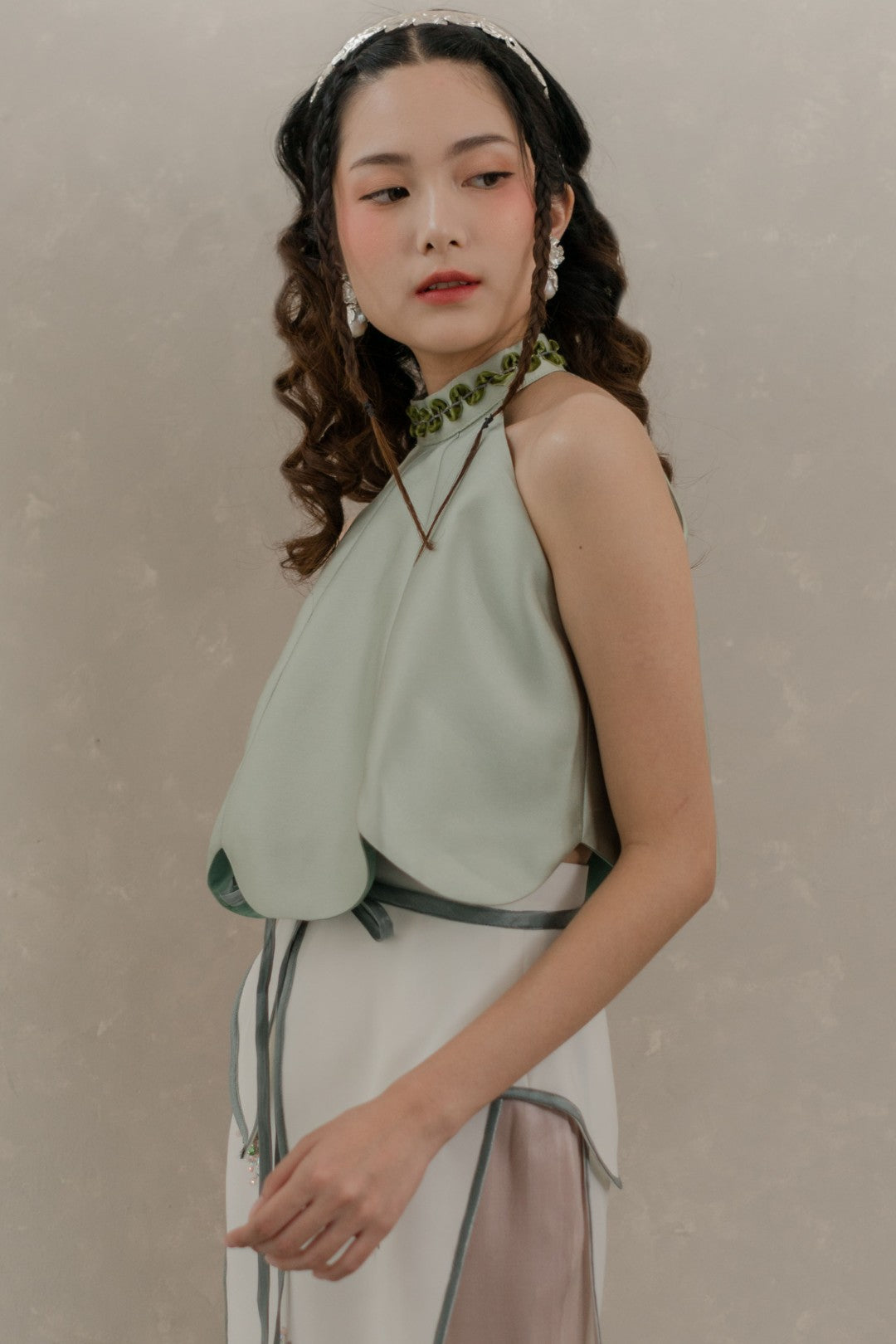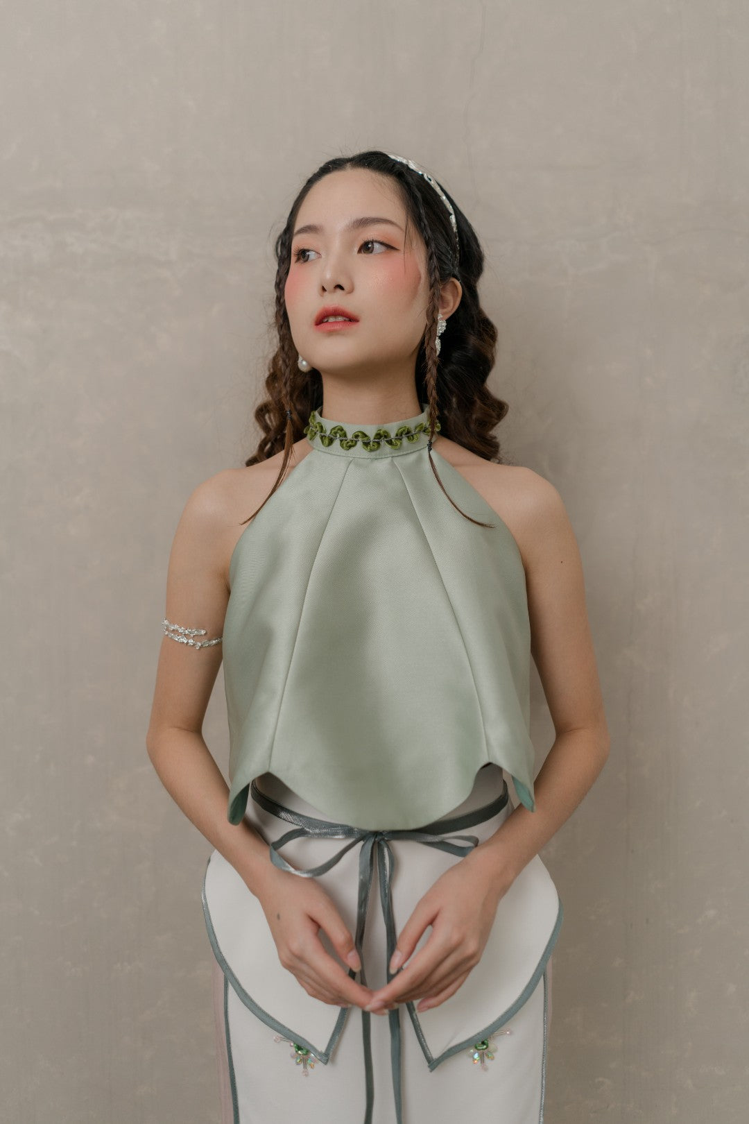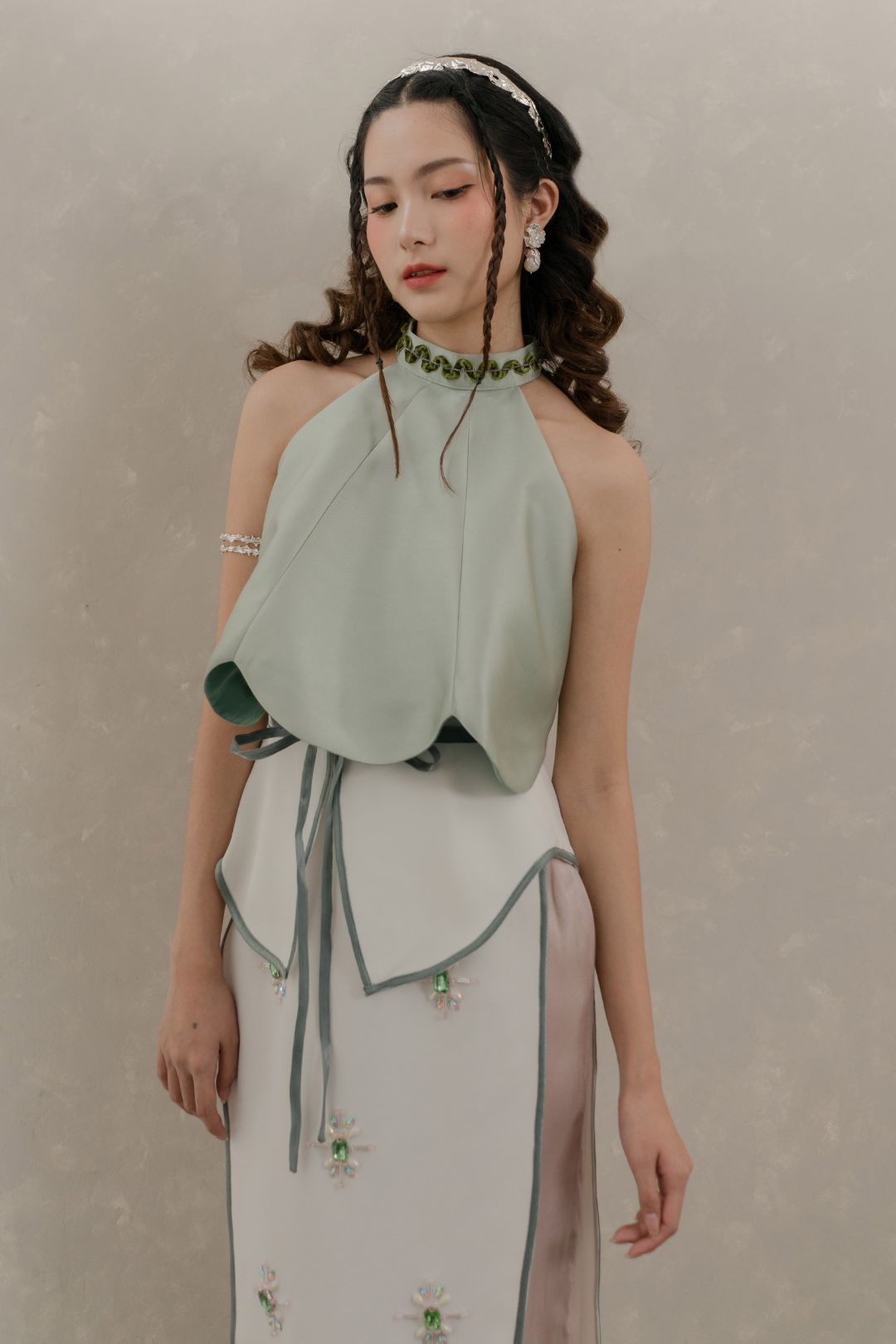 Halter-neck top with intricate embroidery details & scalloped hemlines.