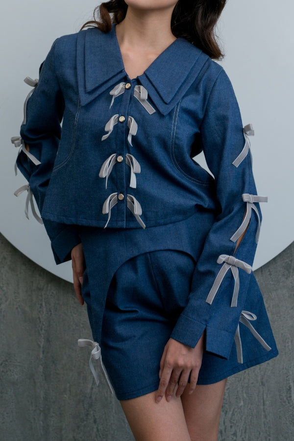 Long-sleeved top in Navy with double collars, adorned with velvet ribbons along the buttons & sleeves