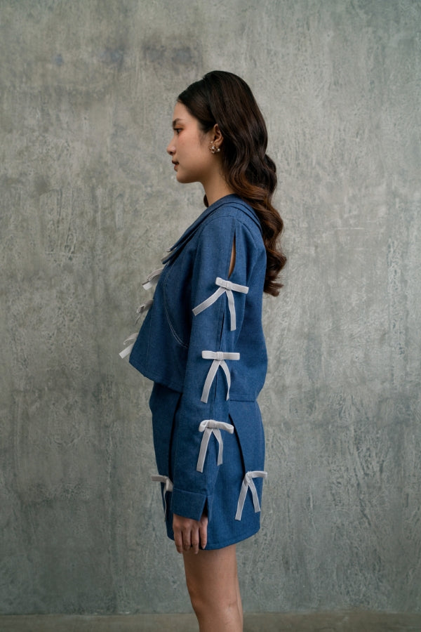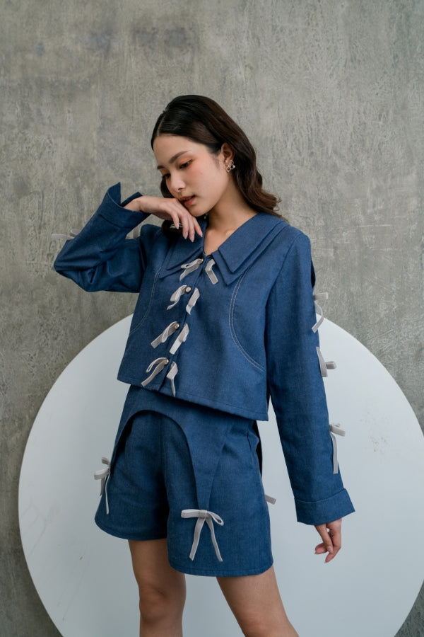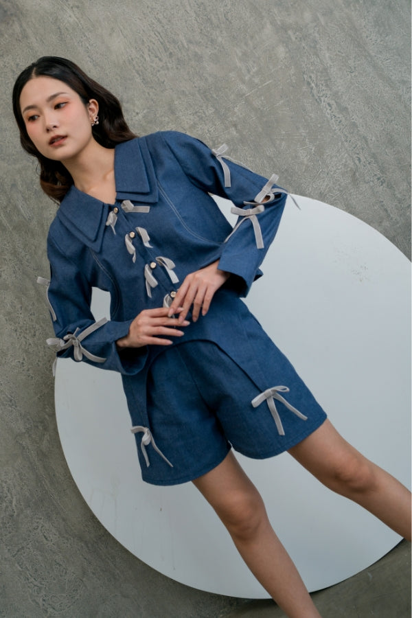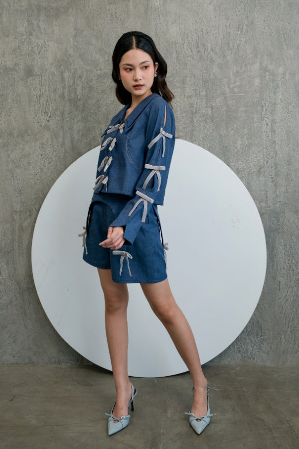 Shorts in Navy with unique waist details & adorned with velvet ribbons.