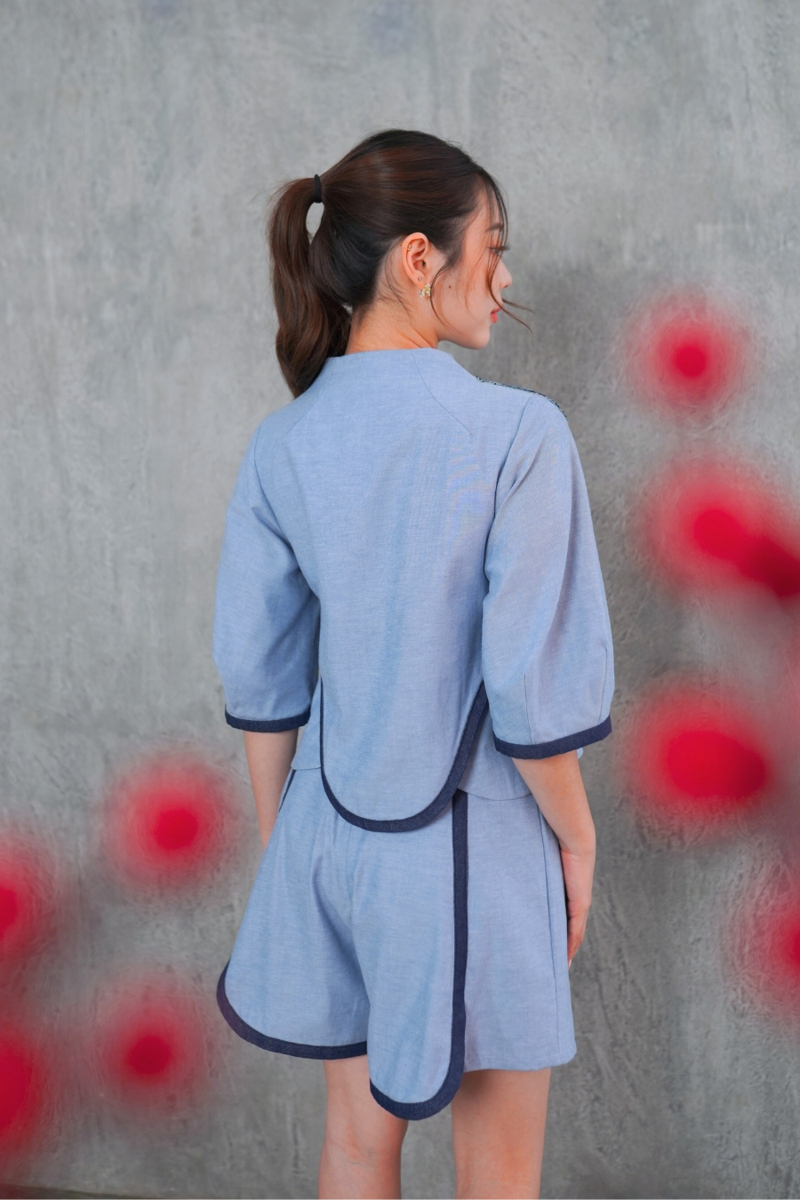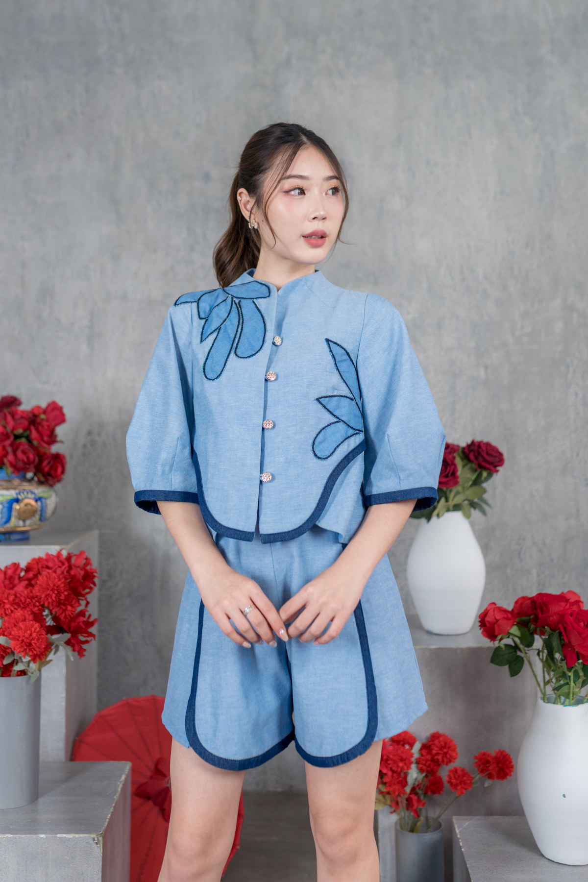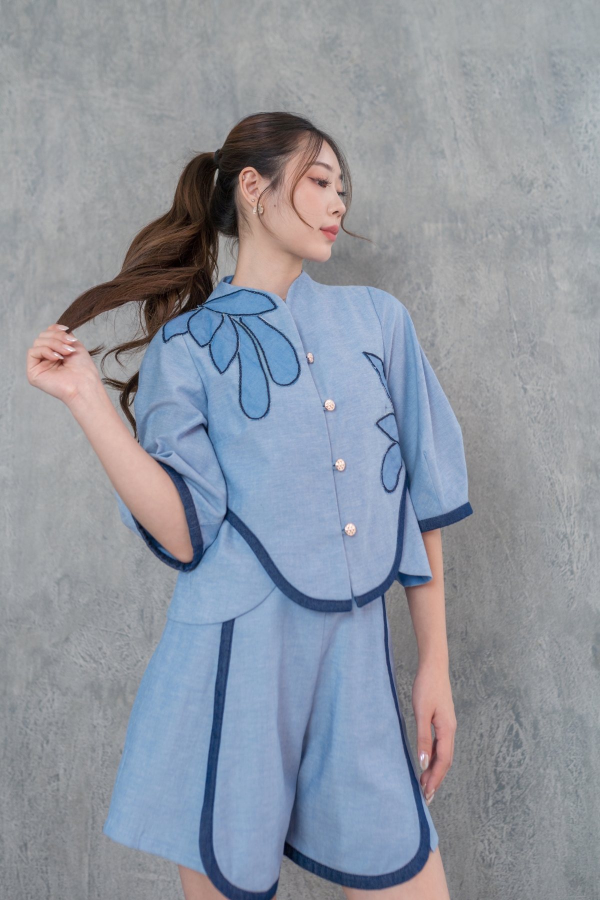 2-tone semi denim set of boxy top with floral patches details & overlapping shorts.