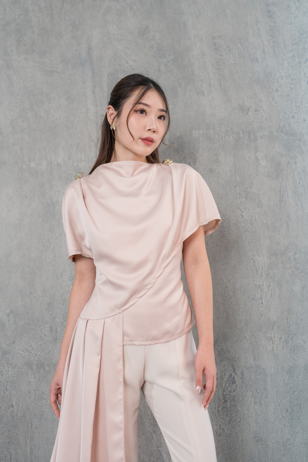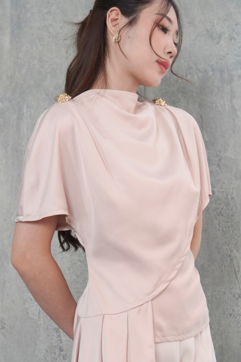 Short-sleeved asymmetrical top with boatneck & our signature floral golden buttons.