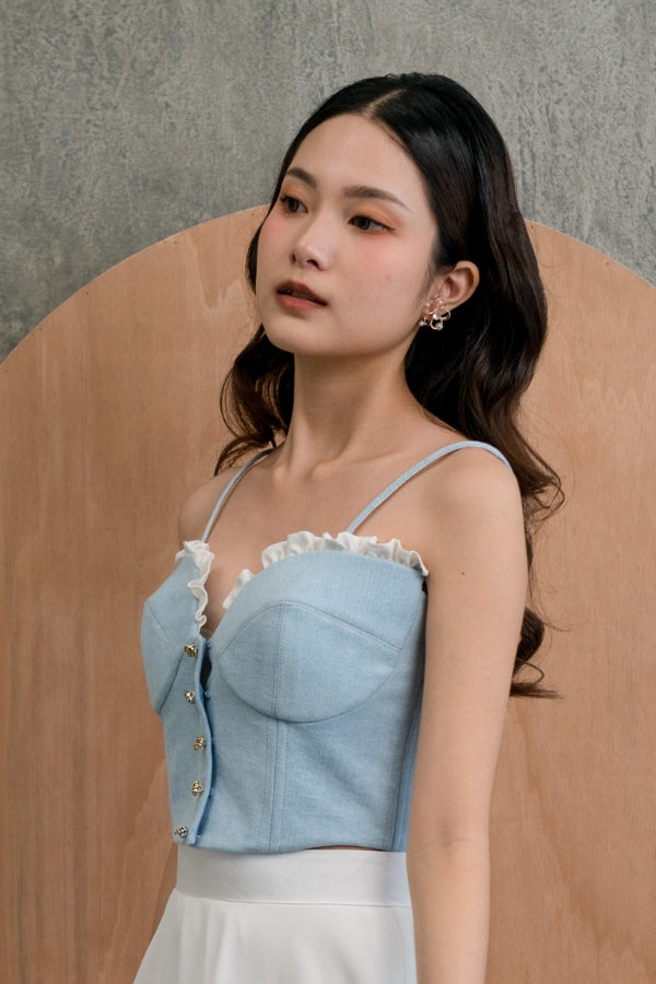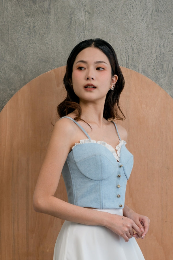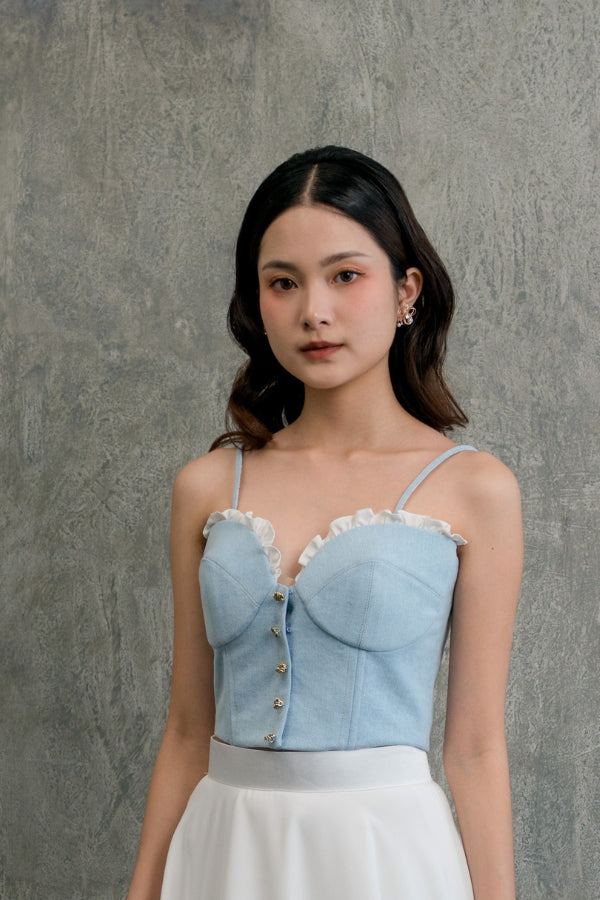 Bustier top in Lightwashed Denim with spaghetti straps & ruffle details on the bust.