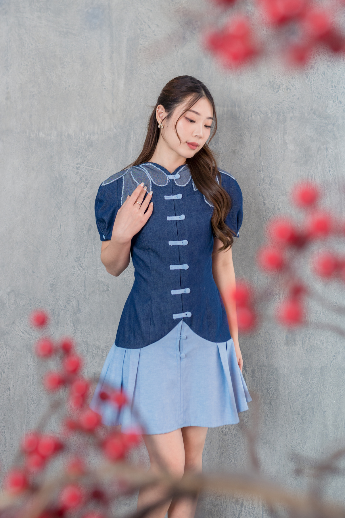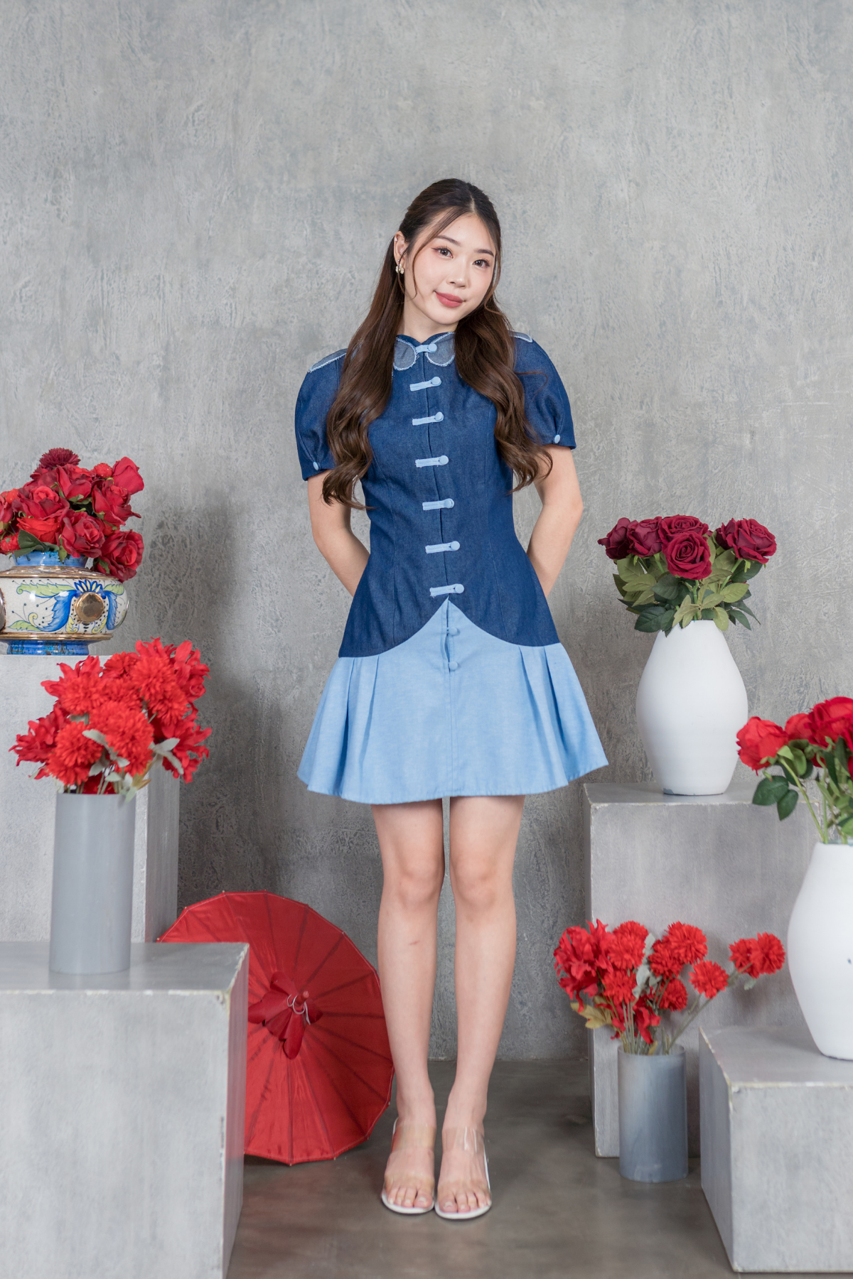 2-tone denim mini dress with floral patches details & mandarin style buttons.