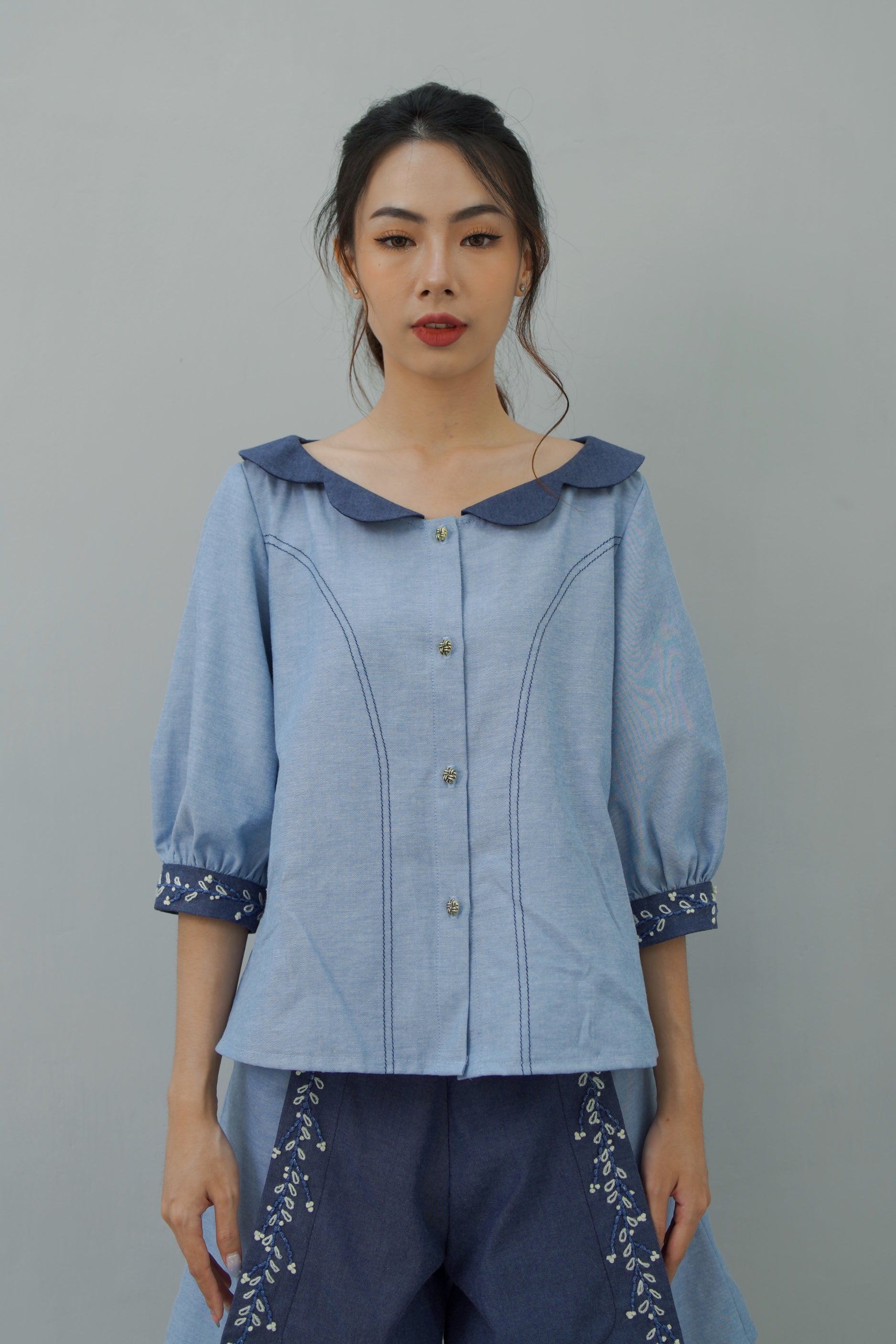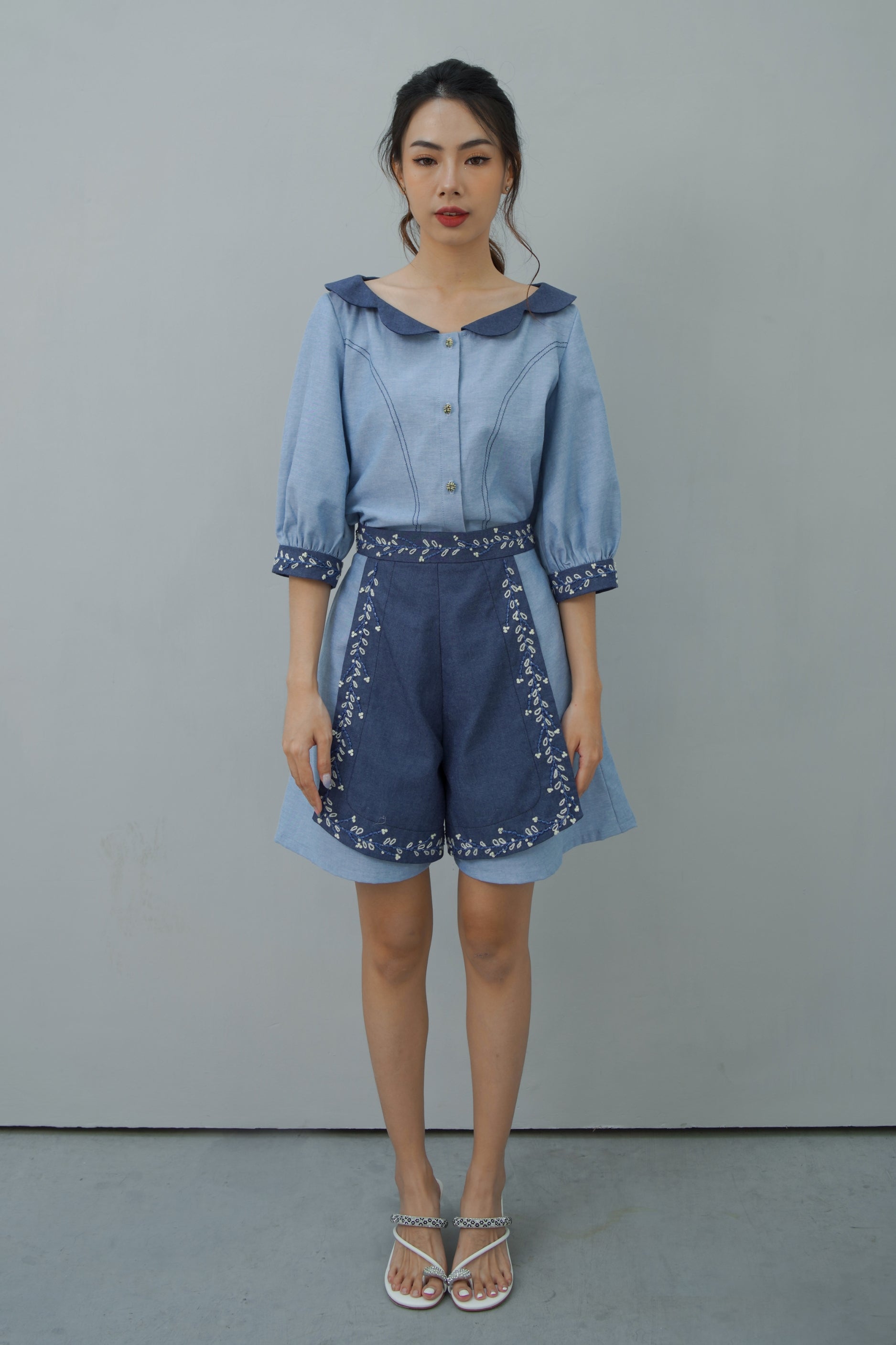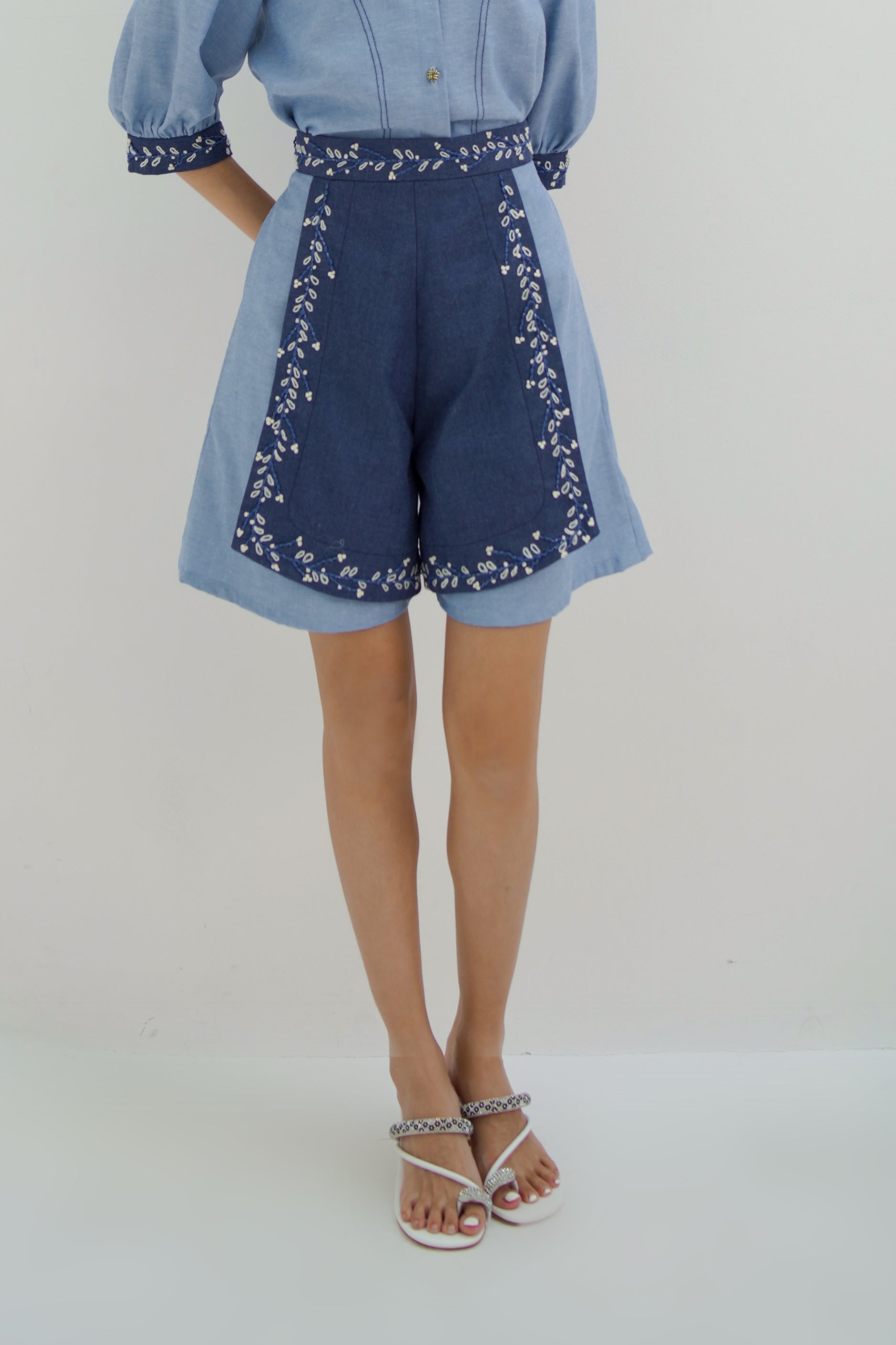 Bermuda shorts with embroidered waist & apron details in contrasting color.
