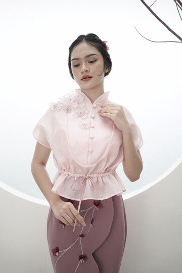 Short-sleeved organza top with Mandarin collar & adjustable waistline, thus creating a peplum