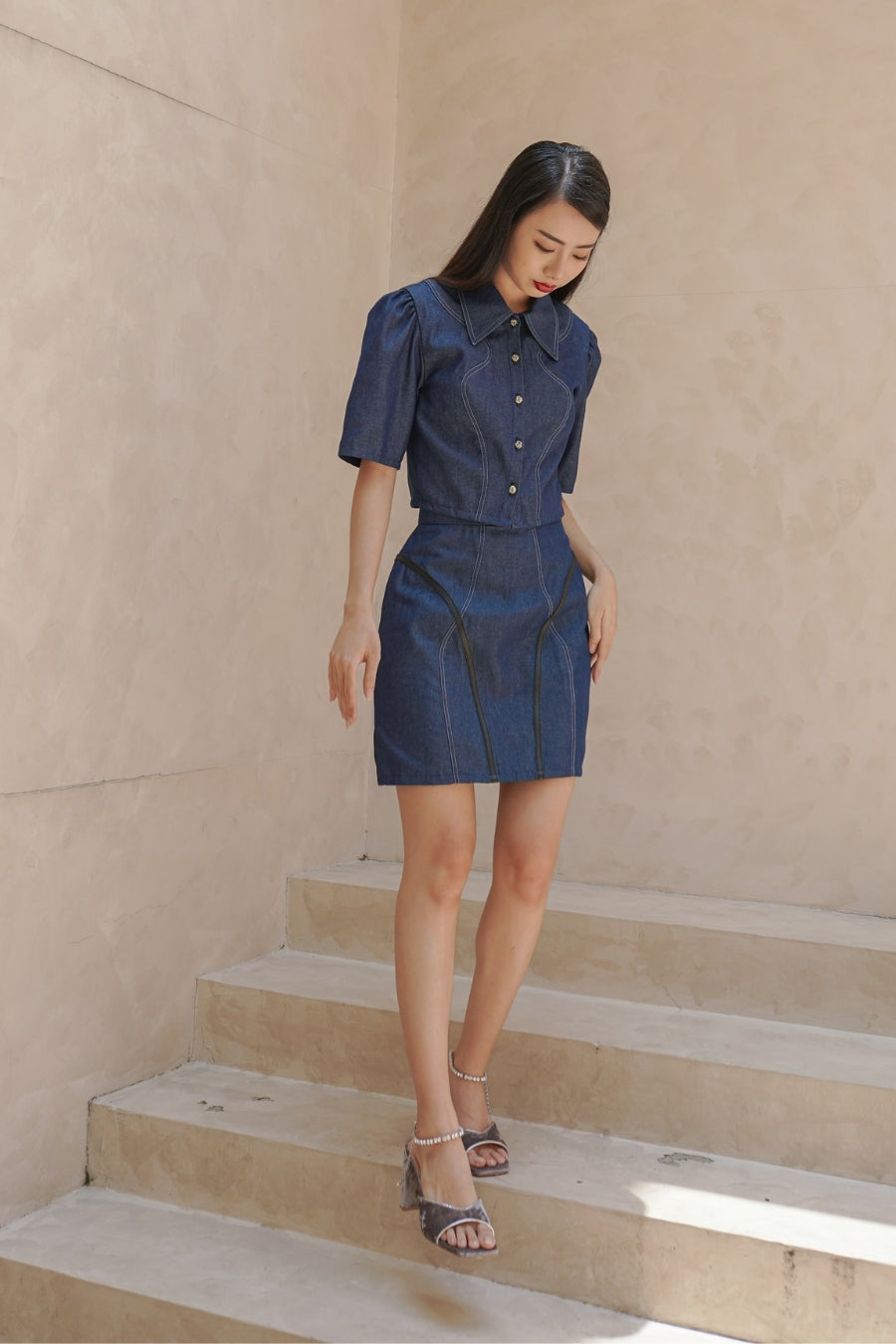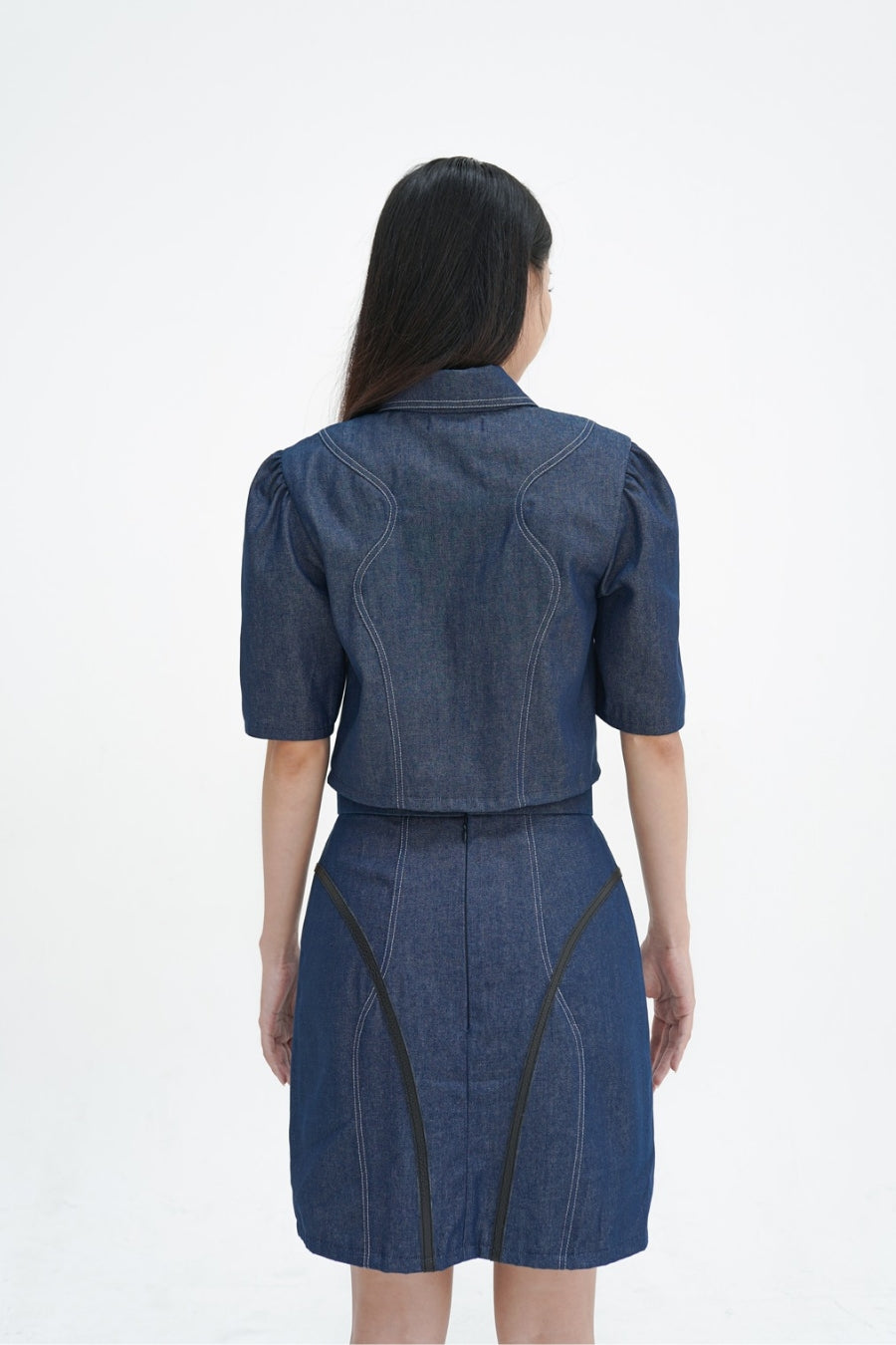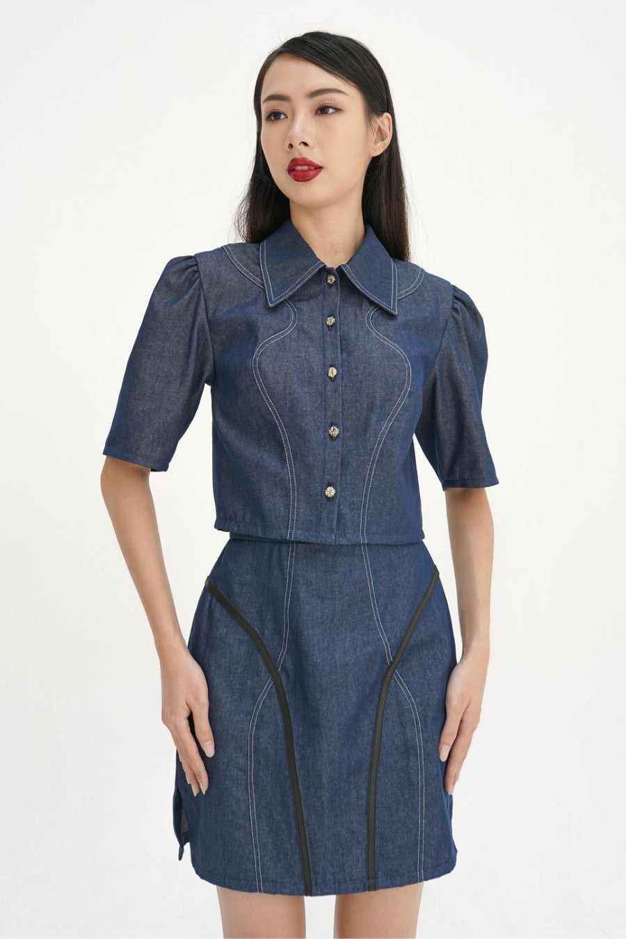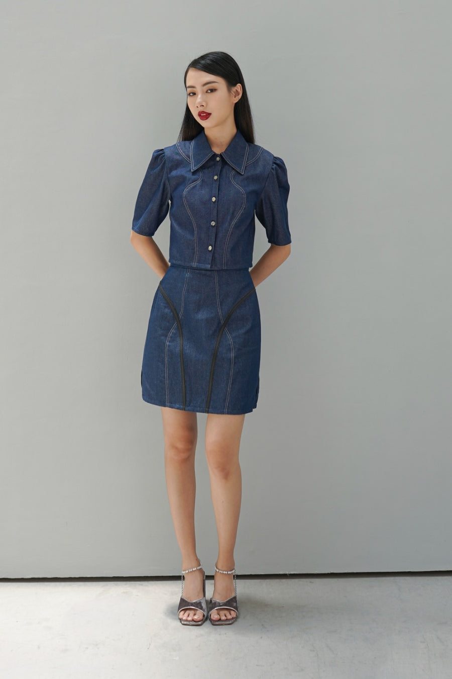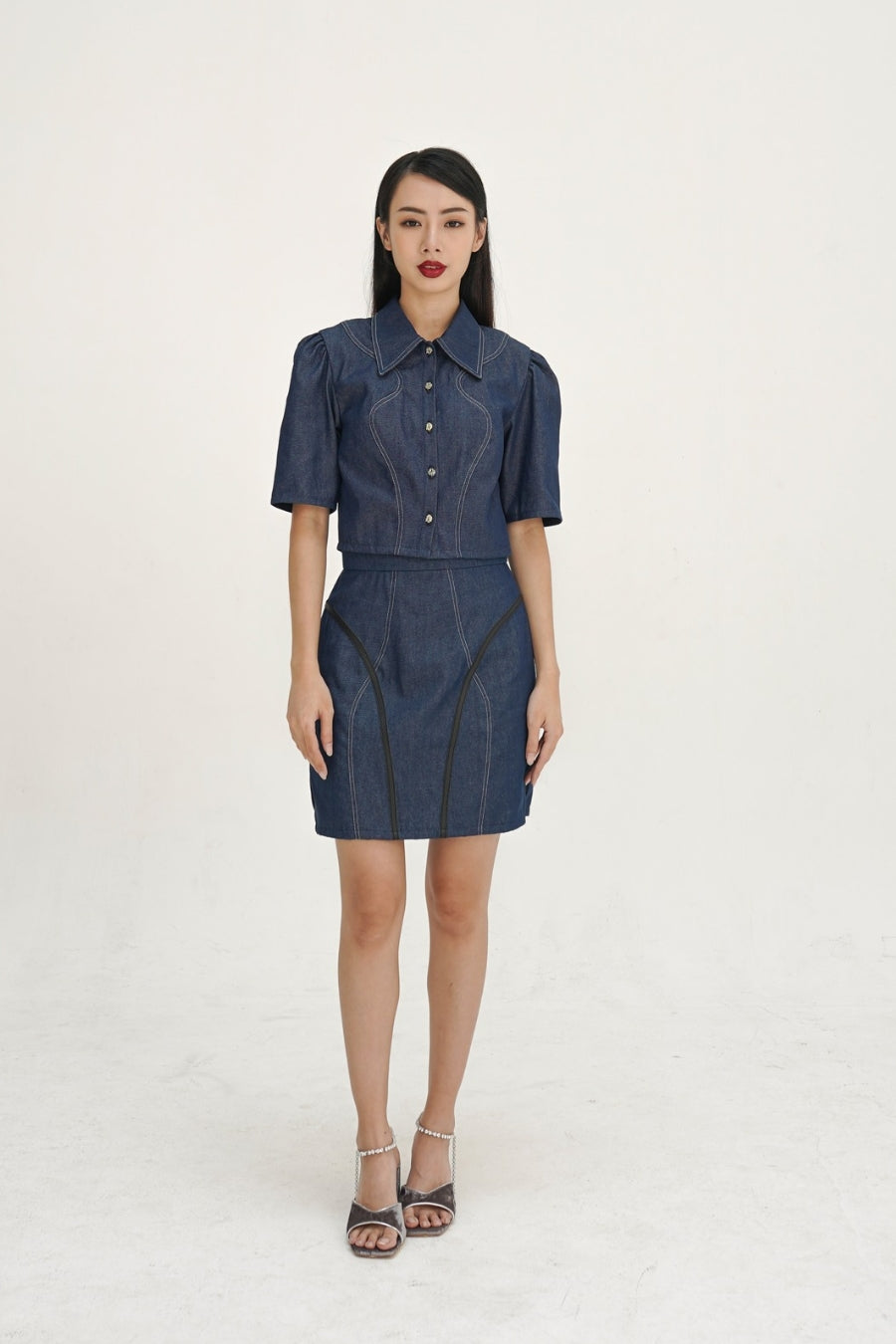 Waist-length denim shirt with ruched short sleeves & contrast stitching details.