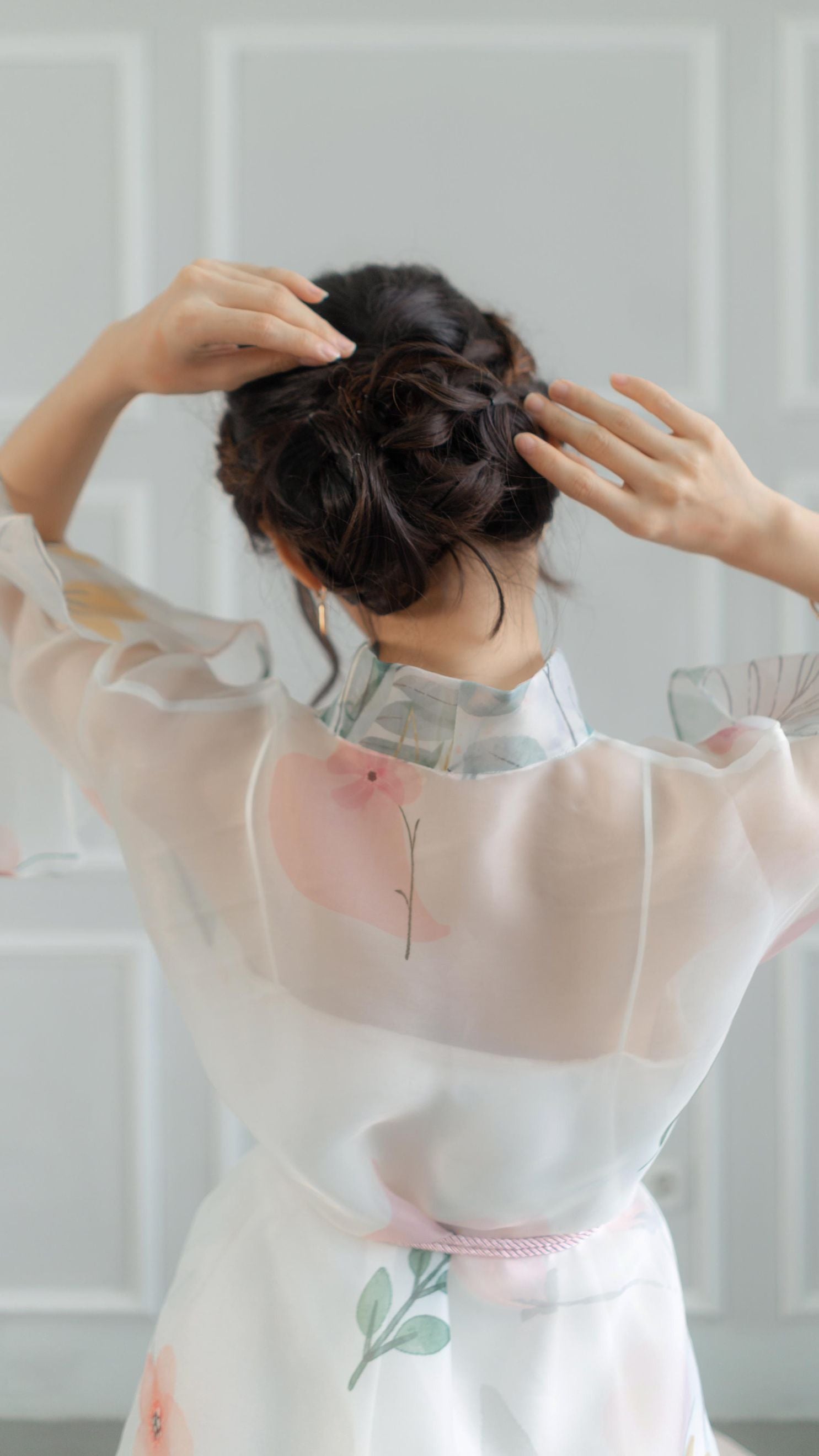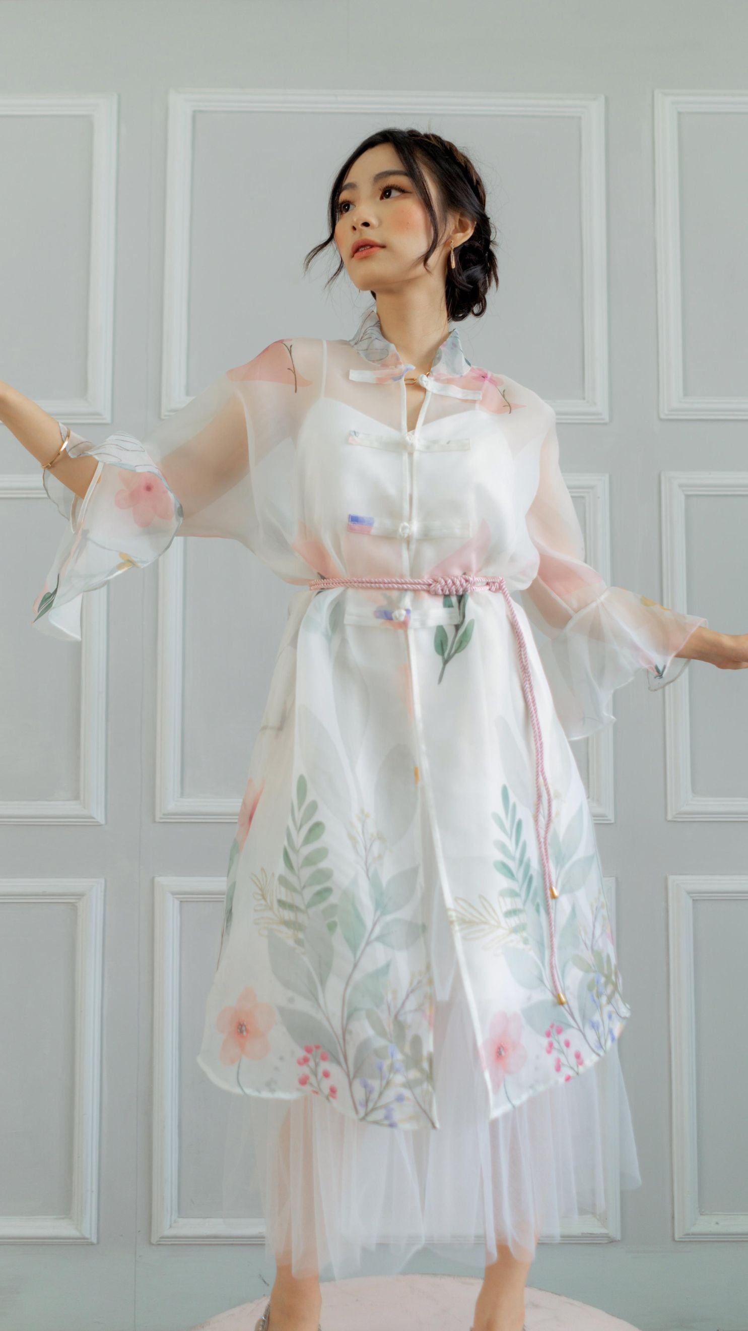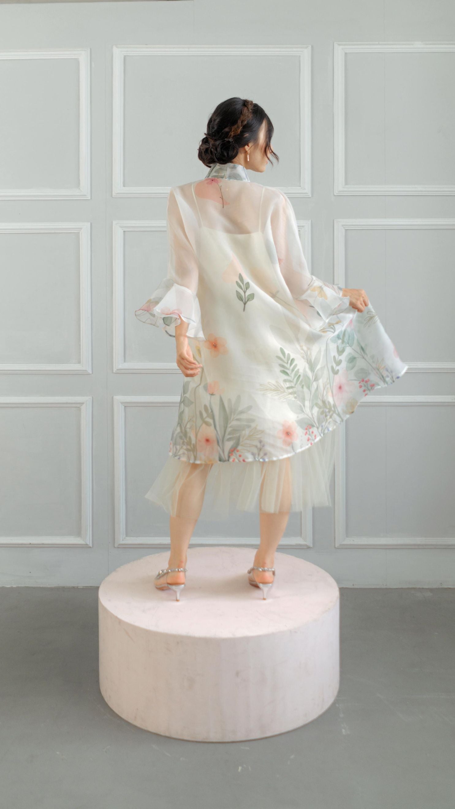 A knee-length maxi outer with a ruffled neckline in our original design floral prints, paired with our versatile camisole-tutu midi dress in yellow