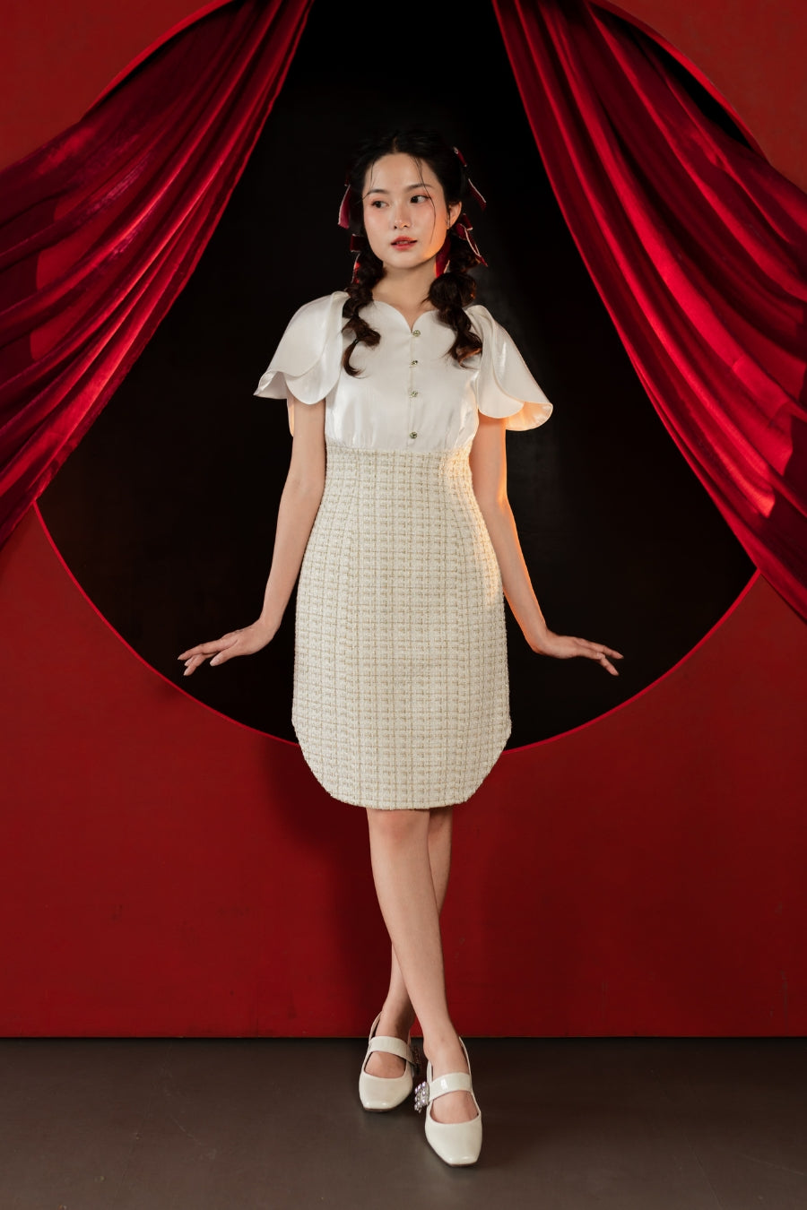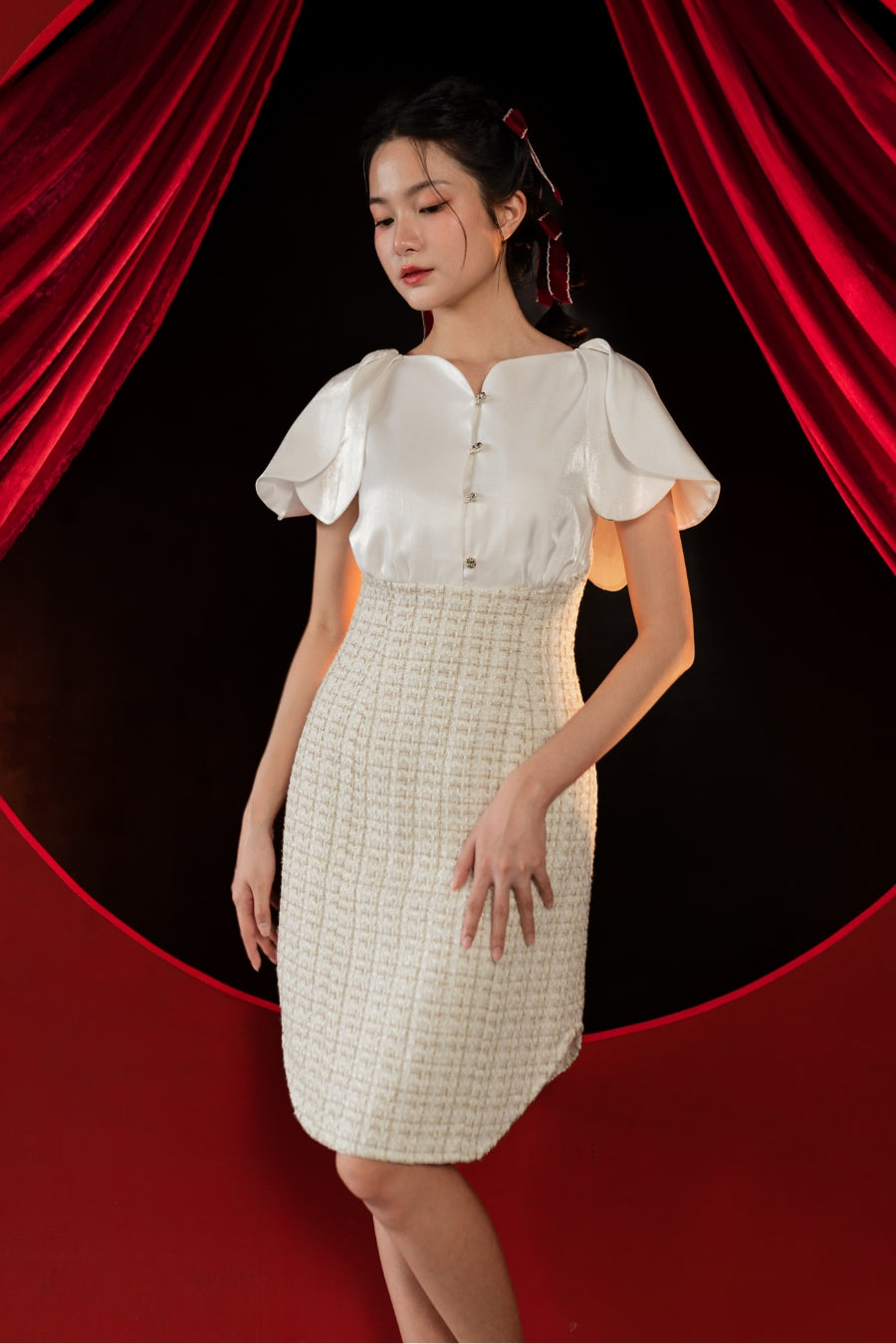 Body-con mini dress with structured tweed bottom & romantic shimmer top, adorned with petal-shaped sleeves.