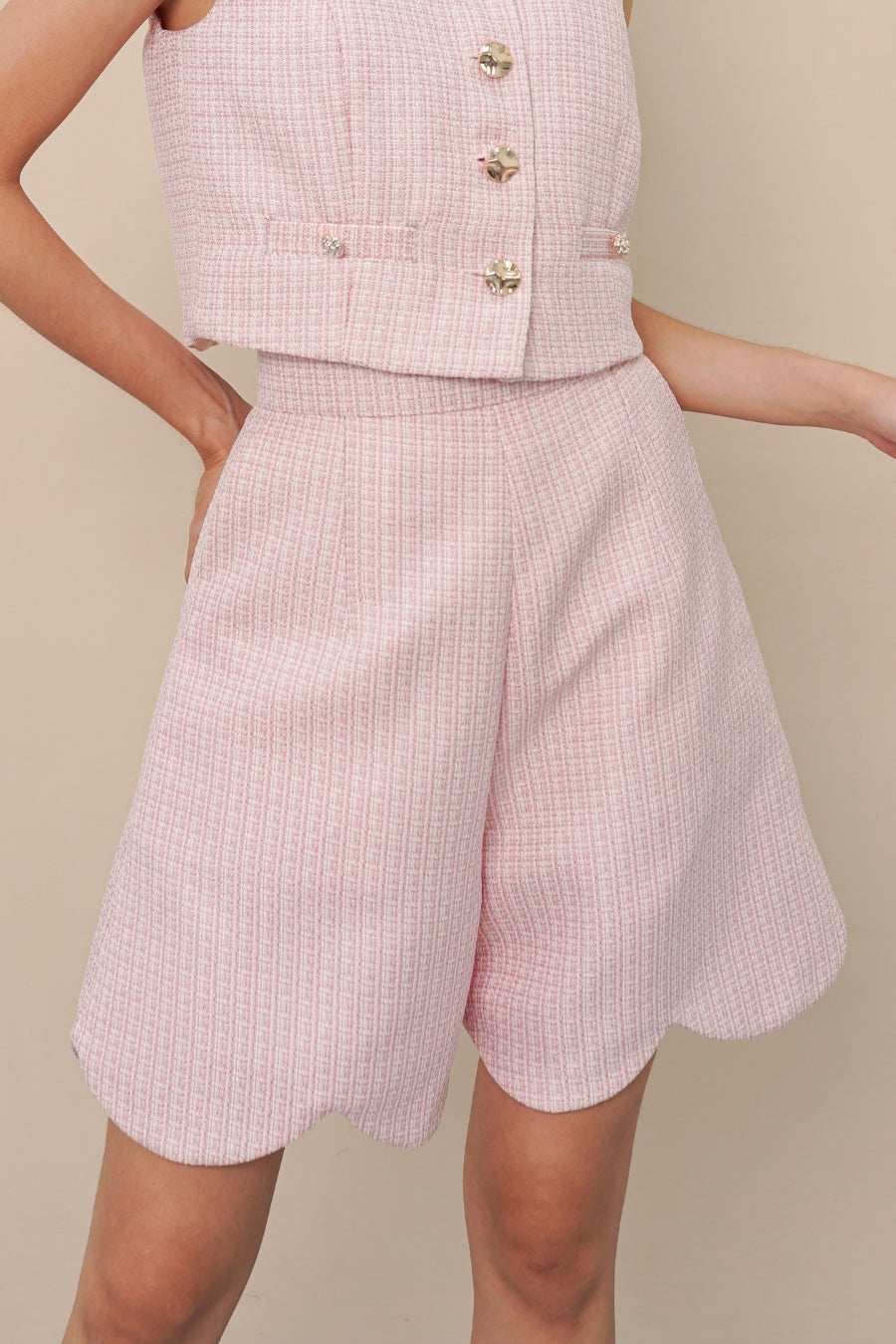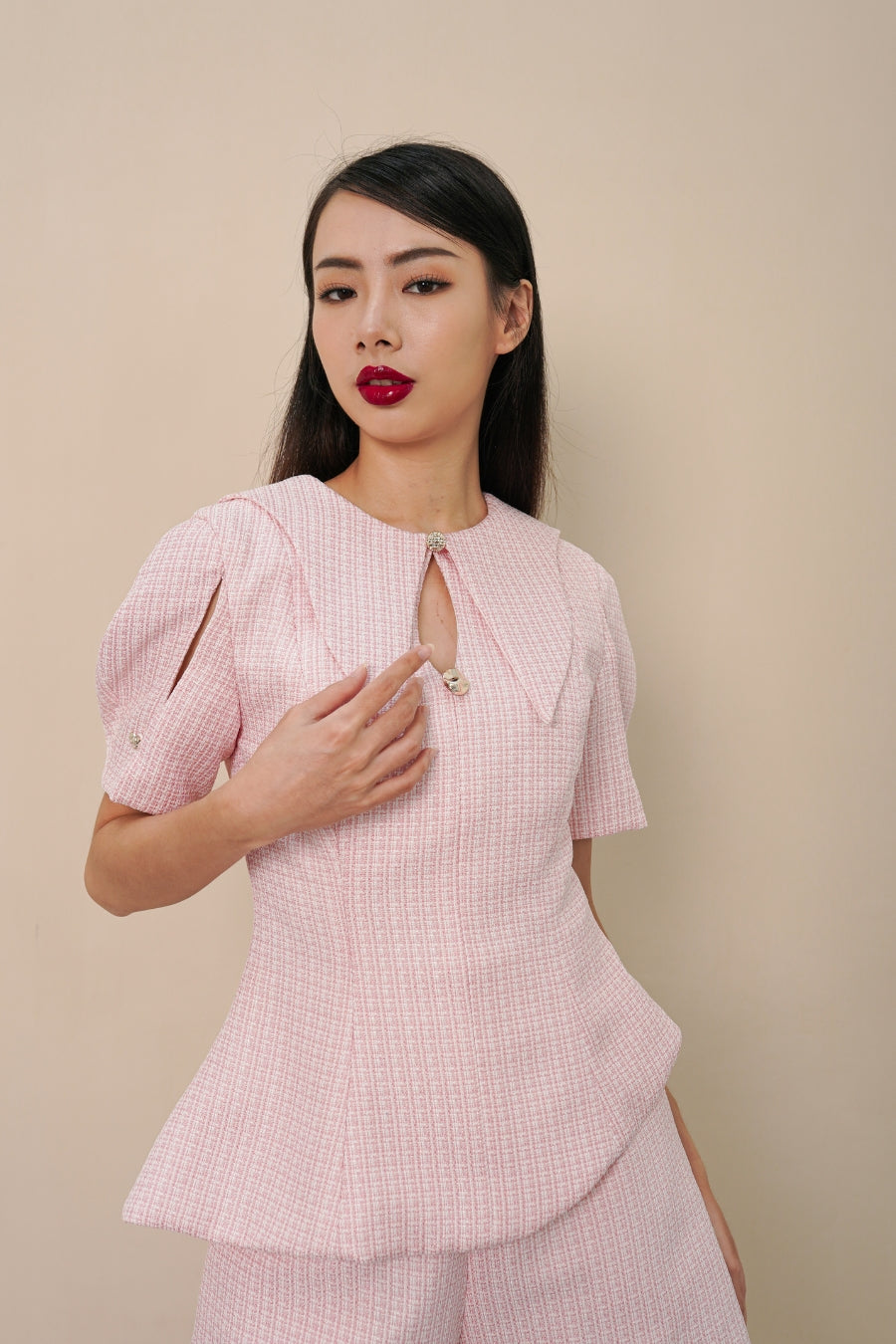 Asymmetrical peplum top with unique cut-out neckline & bud-shaped short sleeves.