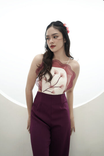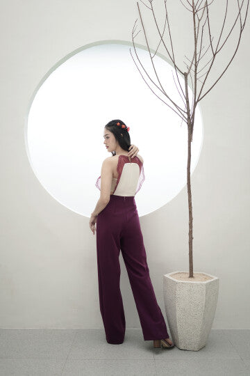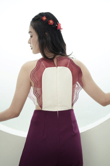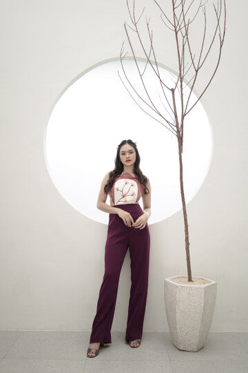 Two-toned, full-length jumpsuit with our signature ruffles & embroideries on the chest